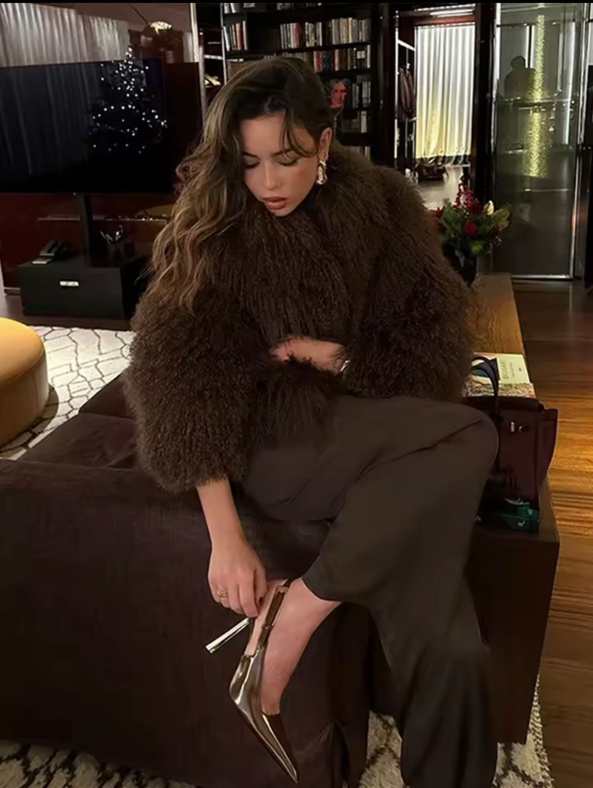 Il design in eco pelliccia a pelo lungo crea un effetto morbido e avvolgente, regalando una presenza forte e moderna senza rinunciare al comfort.