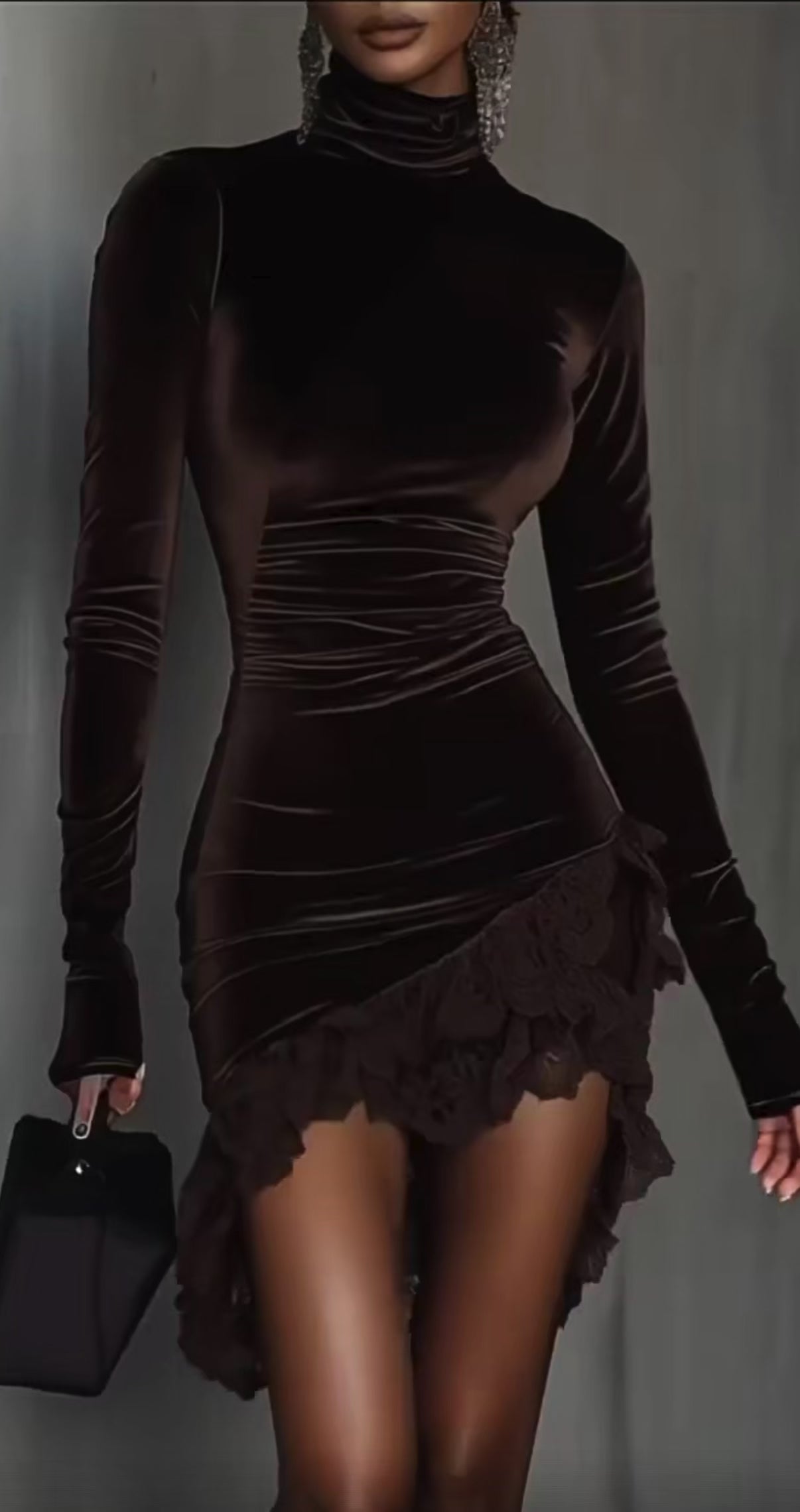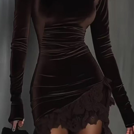 Abito in velluto elasticizzato che segue le linee del corpo, con drappeggi strategici e orlo in pizzo per un effetto femminile e seducente.